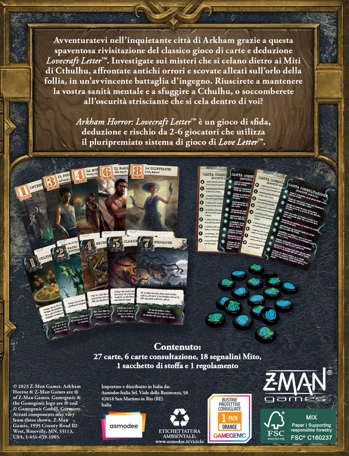 Avventuratevi nell’inquietante città d di Arkham grazie a questa spaventosa rivisitazione del classico gioco di carte e deduzione Lovecraft Letter™. Investigate sui misteri che si celano dietro ai Miti di Cthulhu, affrontate antichi orrori e scovate alleati sull’orlo della follia, in un’avvincente battaglia d’ingegno. Riuscirete a mantenere la vostra sanità mentale e a sfuggire a Cthulhu, o soccomberete all’oscurità strisciante che si cela dentro di voi?
