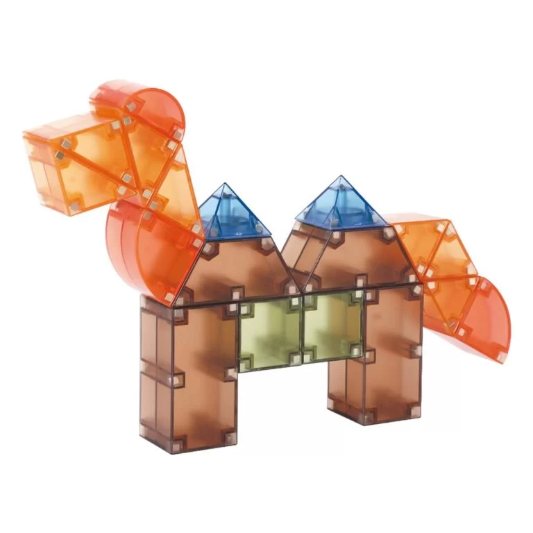 - 32 Pezzi per Forme Composte: Il set include una selezione di blocchi magnetici trasparenti in diverse forme geometriche (quadrati, triangoli, pezzi curvi) e colori vivaci (arancio, verde chiaro, blu). La loro peculiarità sta nella capacità di combinarsi per formare cubi, piramidi e altre strutture complesse in modo intuitivo e divertente.