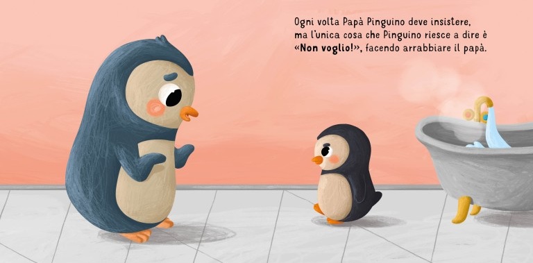 Fare il bagnetto non è sempre un momento semplice per i più piccoli: tra acqua magari troppo fredda, sapone negli occhi e un po’ di noia, può trasformarsi in una vera sfida quotidiana. Pinguino lo sa bene: ogni sera trova mille scuse per non fare il bagno, ma grazie alla pazienza del suo papà e all’aiuto di un simpatico narvalo di gomma, riuscirà finalmente a trovare le parole per esprimere le sue paure. Il bagnetto, così, diventerà un’occasione speciale per giocare, rilassarsi e condividere momenti di complicità.