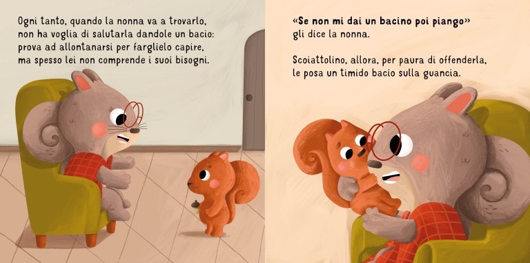 Una storia delicata e preziosa che affronta un tema importante: il diritto dei bambini a dire “no” quando non vogliono baci o abbracci. Scoiattolino, infatti, impara a esprimere i propri sentimenti con l’aiuto di un mantello speciale, creato da Mamma Scoiattolo per far capire agli altri che a volte ha bisogno di spazio. Questo racconto aiuta i bambini a comprendere che il loro corpo è solo loro e che hanno il diritto di decidere come e quando ricevere gesti di affetto. Allo stesso tempo, insegna agli adulti e ai compagni a rispettare i confini degli altri, promuovendo un messaggio fondamentale: il consenso va imparato fin da piccoli.