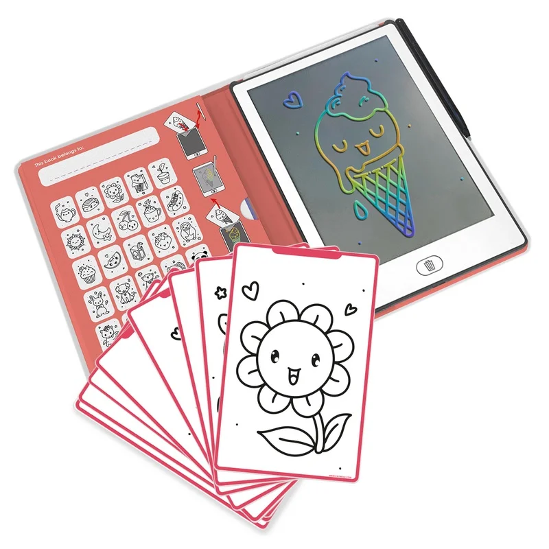 Con una tavoletta grafica interattiva, puoi regalare ai tuoi bambini ore e ore di divertimento creativo. Il tablet leggero con un display LCD da 8,2" e 30 illustrazioni portatili sarà un ottimo compagno per bambini e bambine contro la noia, a casa e in viaggio. I bambini possono disegnare seguendo il modello che posizionano sotto il display del tablet e, quando si sentiranno più sicuri, potranno iniziare a dipingere i propri disegni. Disegnando sulla tavoletta, possono migliorare le loro capacità pittoriche e sviluppare la loro immaginazione. La tavoletta è dotata di un pratico elastico che la mantiene chiusa e impedisce alle sagome di cartone di cadere.
