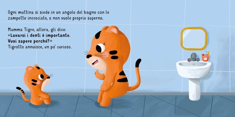Lavarsi i denti è un gesto quotidiano importante, ma per i più piccoli può sembrare noioso o difficile da capire. Questo libro racconta la storia di Tigrotto, un cucciolo che non ha voglia di spazzolarsi i denti, fino a quando la sua mamma gli spiega perché è così importante prendersene cura. Attraverso semplici spiegazioni e un approccio giocoso, Tigrotto scoprirà come lavare bene i denti e renderlo un momento piacevole da condividere.