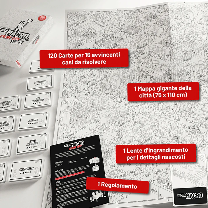 Micromacro Crime City è un gioco da tavolo cooperativo investigativo che richiederà un lucido ragionamento deduttivo, attenta osservazione e collaborazione tra i giocatori.