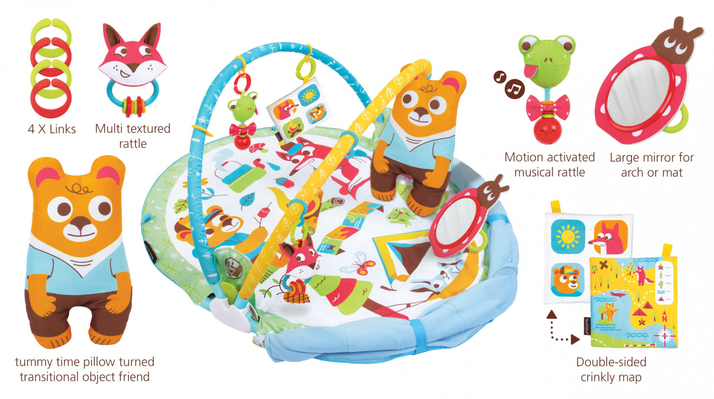 4 attacchi per adattare i giochi alla portata del bambino. facilmente ripiegabile per comoda custodia da viaggio. Tappeto lavabile in lavatrice