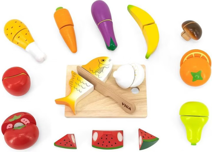 Il set da taglio contiene un tagliere in legno e un coltello. Taglia gli alimenti a metà o in più pezzi e ricomponili con il velcro.